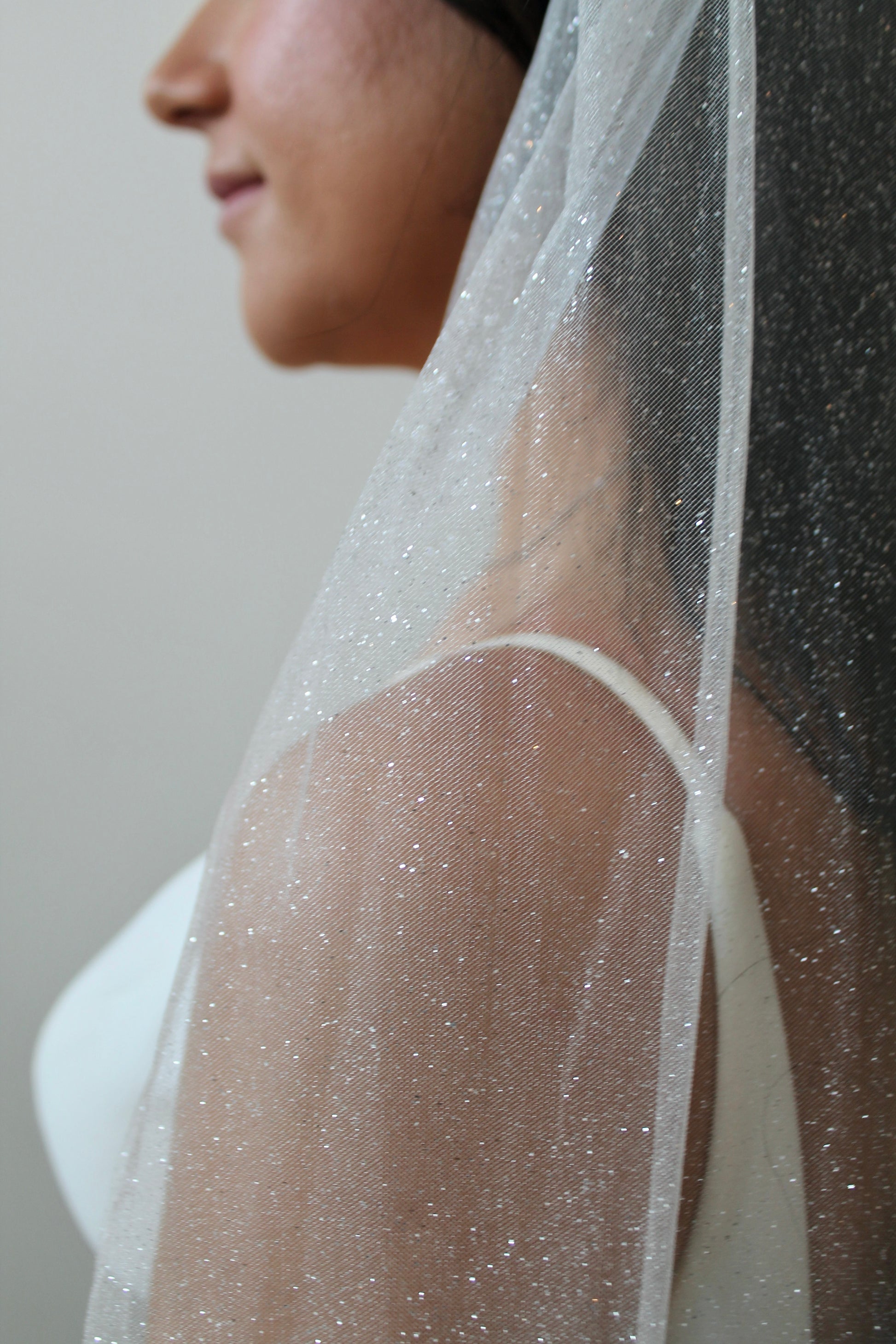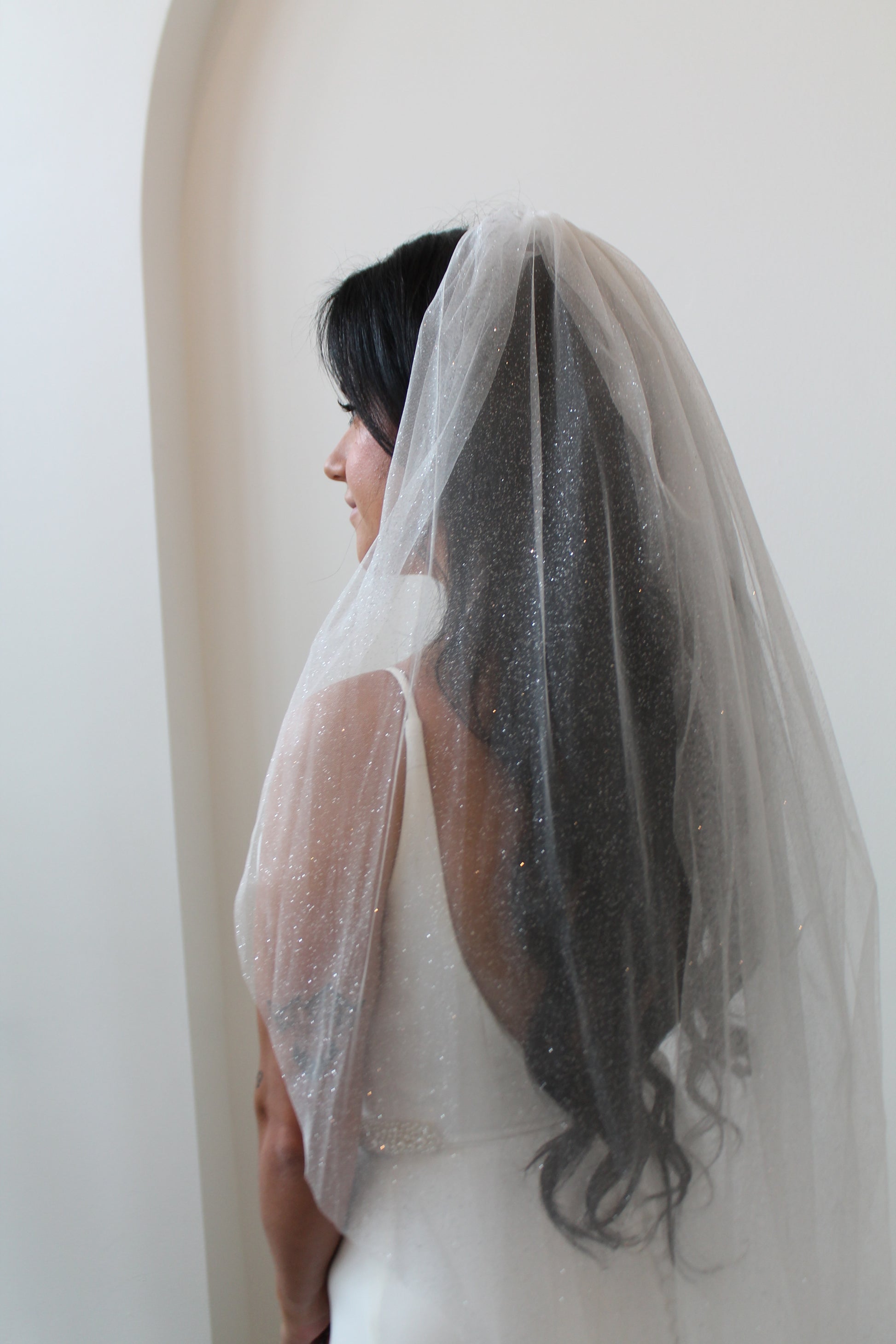 For the bride who wants to shine, this veil is crafted from soft ivory tulle infused with fine silver glitter that catches the light with every movement. The shimmer feels airy and magical—never overpowering—creating a radiant, ethereal finish that sparkles like stardust.