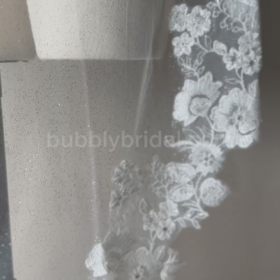 Romantic and refined, this waltz-length veil is crafted from soft ivory tulle and finished with elegant Alençon lace in a floral motif. Sparkling rhinestones, delicate sequins, and subtle beading are hand-placed along the lace for a graceful, light-catching finish. Perfect for the bride seeking movement, elegance, and timeless detail.