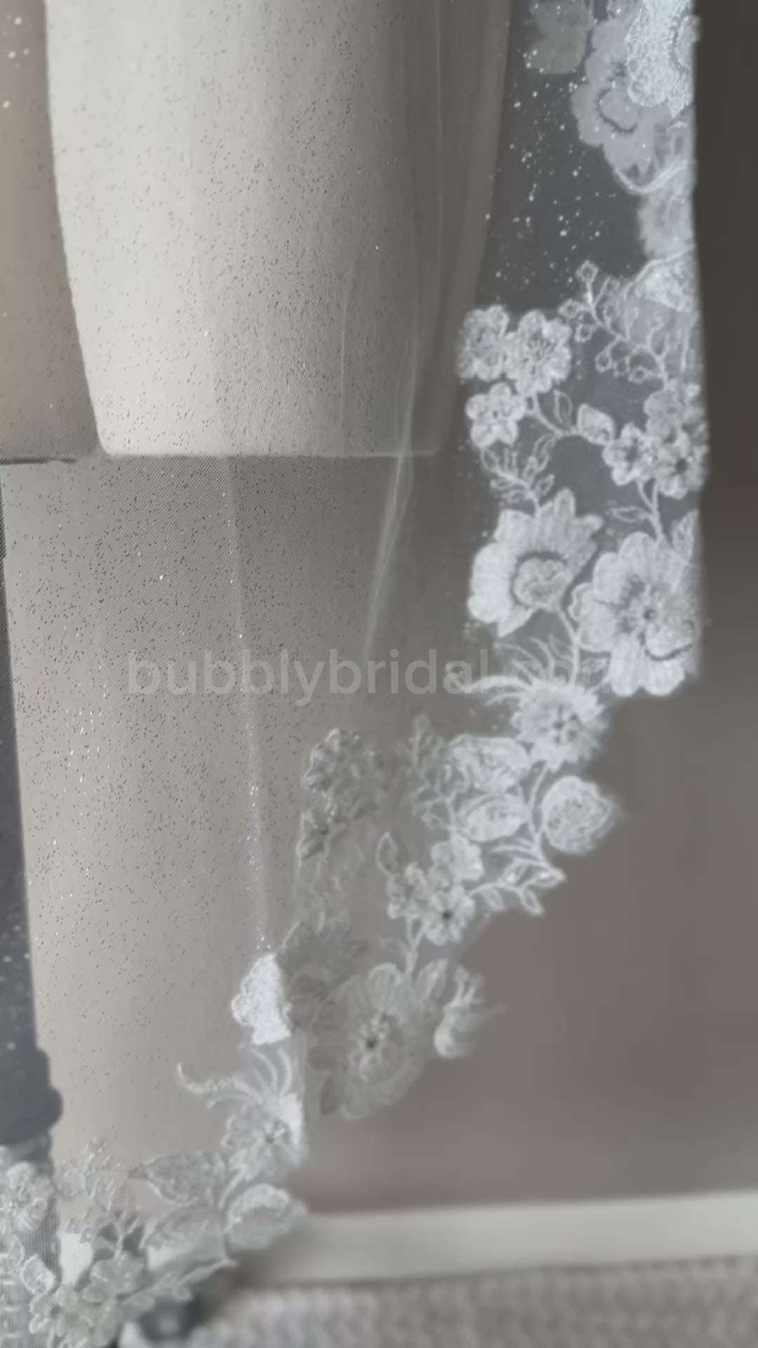 Available in and pictured in a glitter tulle variation for the bride who is looking for an extra level of glam to add to her perfect look.
