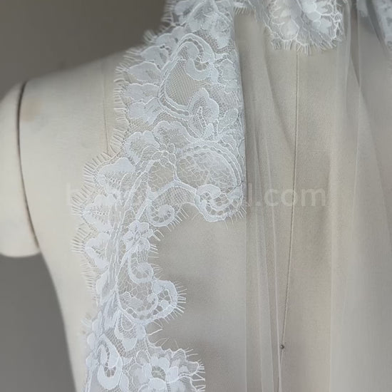 This romantic mantilla veil is crafted from airy ivory tulle and framed with delicate Chantilly lace, creating a soft, vintage-inspired silhouette. The lace extends gently into the hairline for a seamless, graceful finish—perfect for a bride drawn to timeless elegance and quiet beauty.