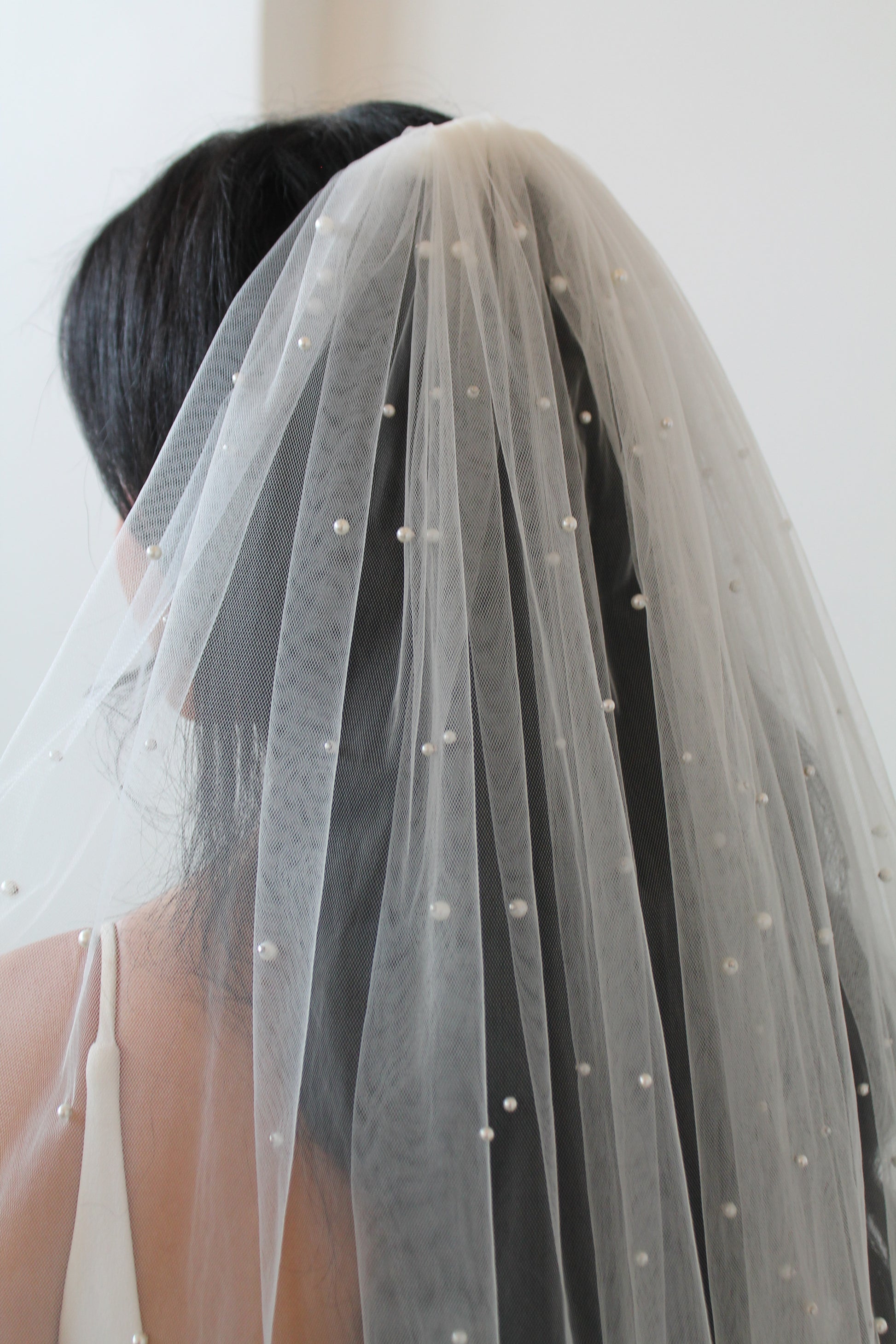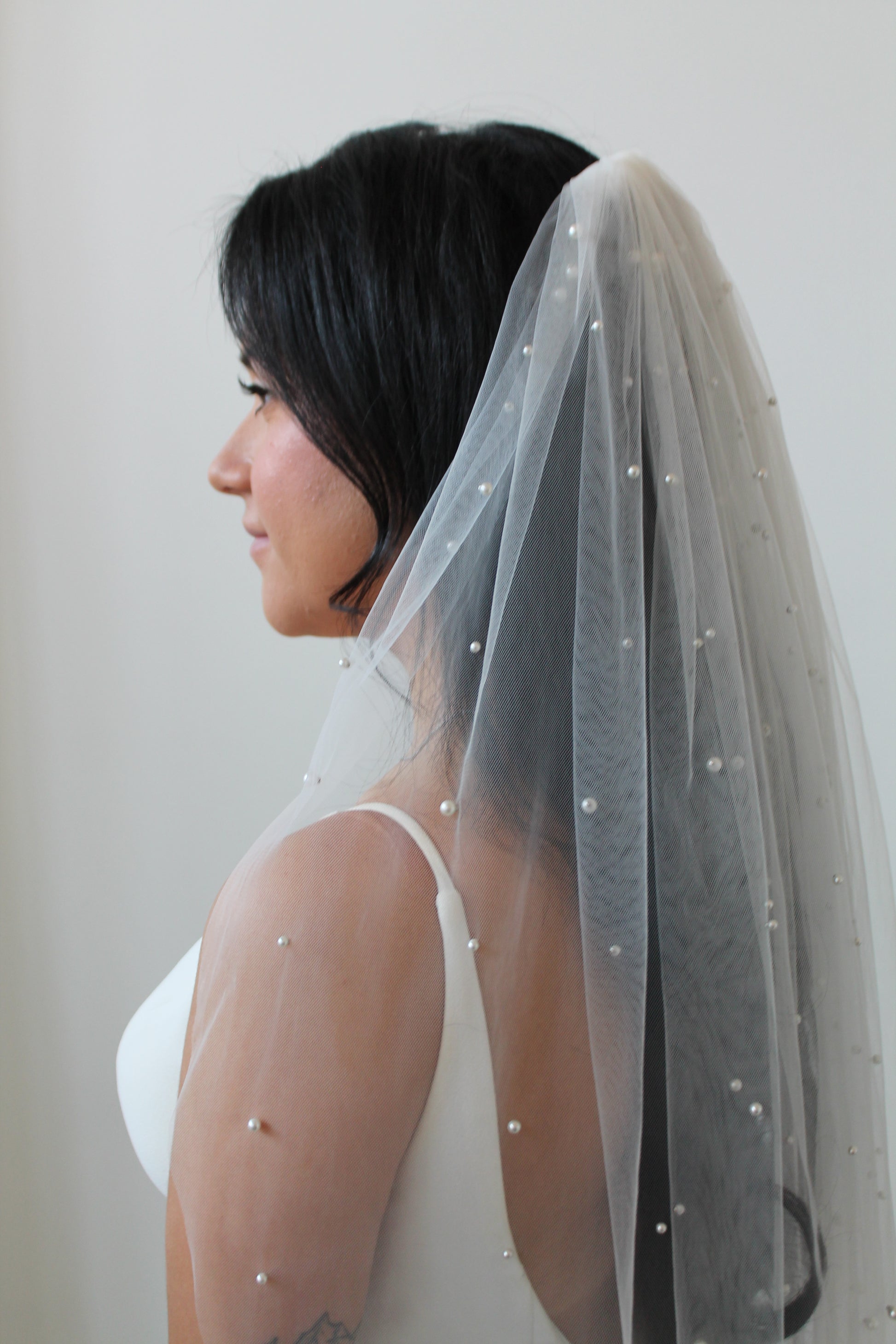 Delicate and graceful, this dreamy veil is crafted from soft ivory tulle and adorned with scattered pearls in varying sizes. The floating effect adds subtle texture and a romantic glow—perfect for the bride who loves timeless beauty with a modern touch.