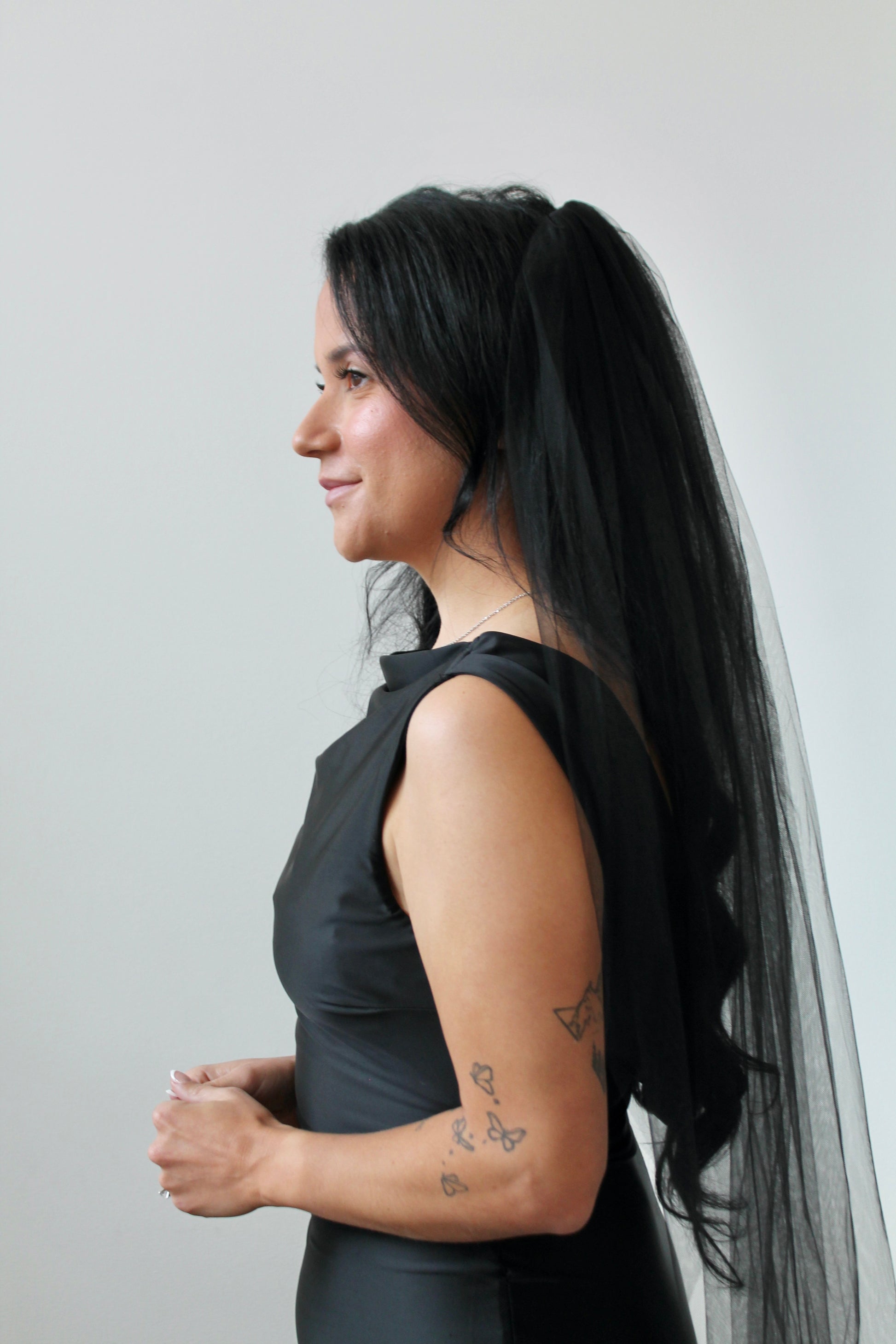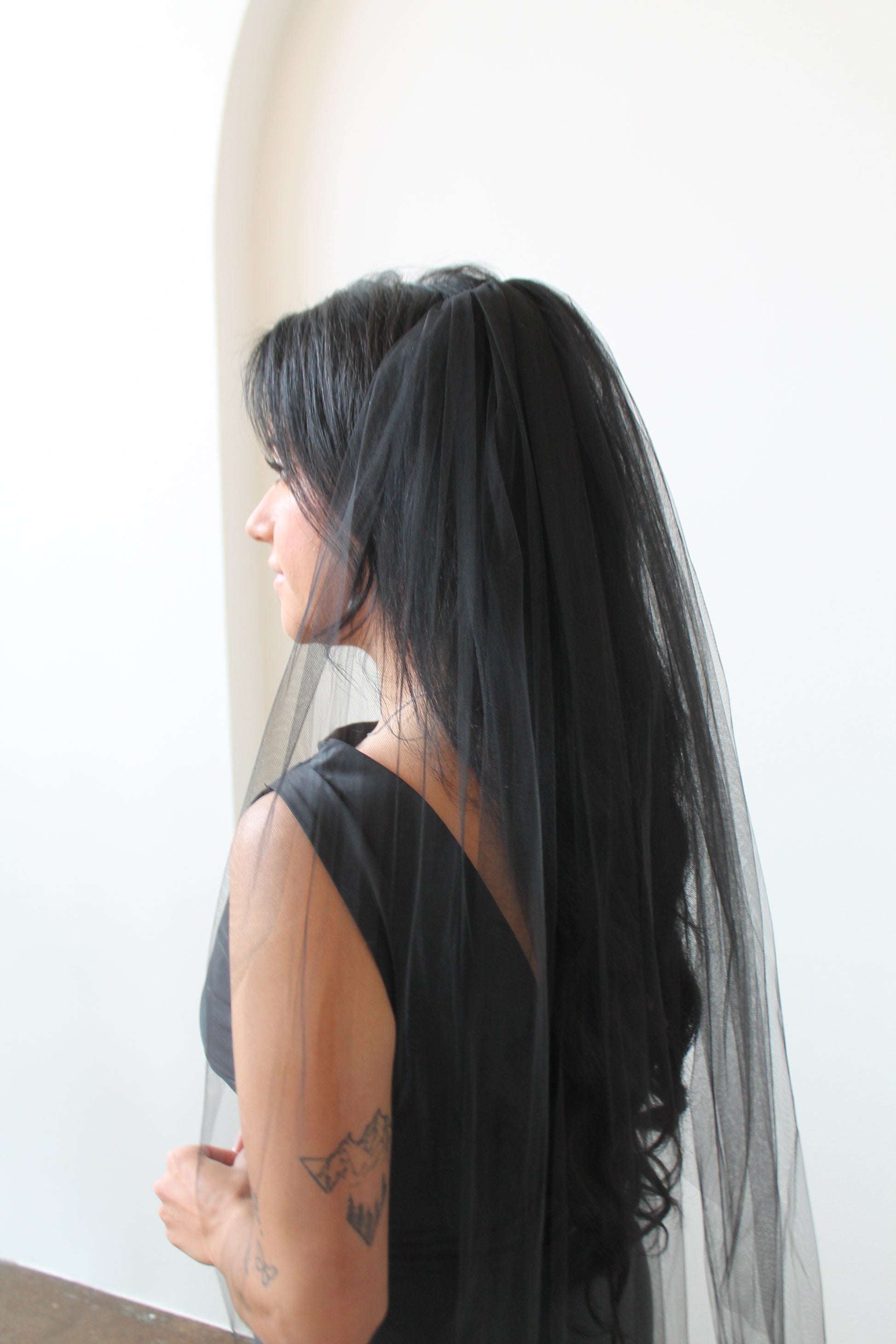A modern twist on a timeless look, this veil is crafted from airy black tulle for a look that’s equal parts bold and romantic. Soft and fluid with a flawless edge, it’s perfect for the bride who dares to be different while embracing elegance and mystery.