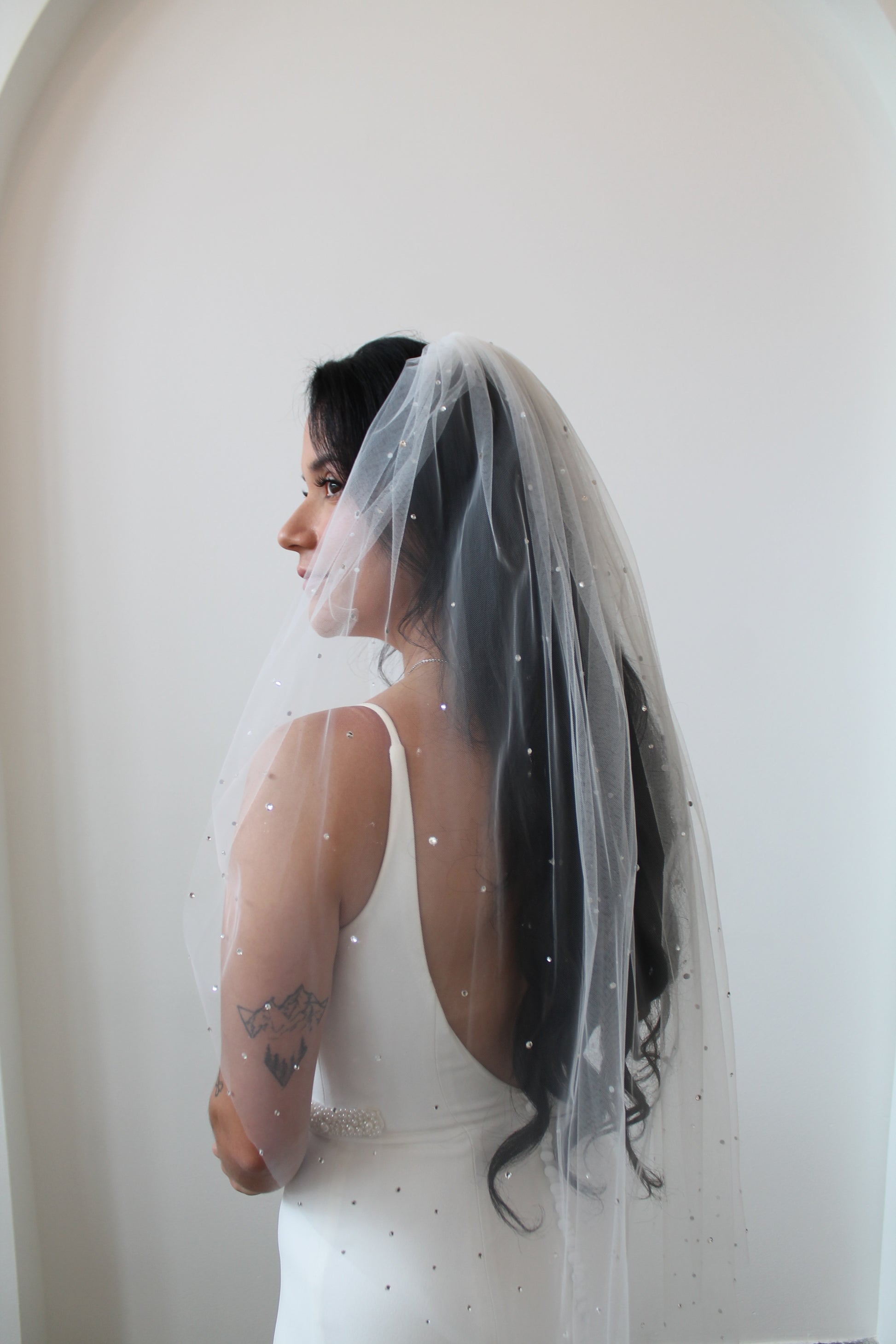 Delicate and dazzling, this veil is crafted from soft ivory tulle and scattered with a stardust of radiant rhinestones in varied sizes. The cut edge keeps the look clean and modern, while the shimmering stones add a celestial sparkle with every movement. Perfect for the bride who wants a hint of glam without overwhelming her look.