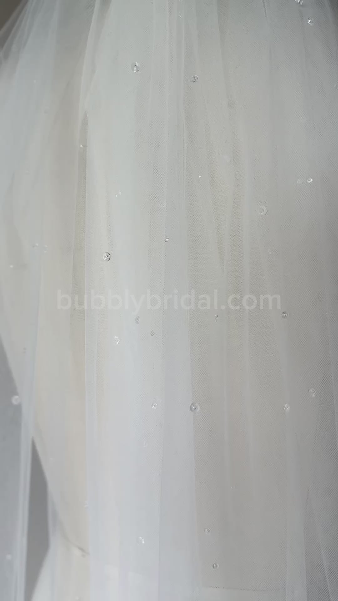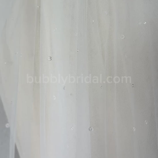 Crafted from soft ivory tulle, this veil features handsewn crystals in varied sizes, scattered like dewdrops along the fabric. The result is a light-catching, ethereal shimmer that feels effortless and enchanting. A delicate blend of sparkle and simplicity, perfect for a softly romantic bridal look.