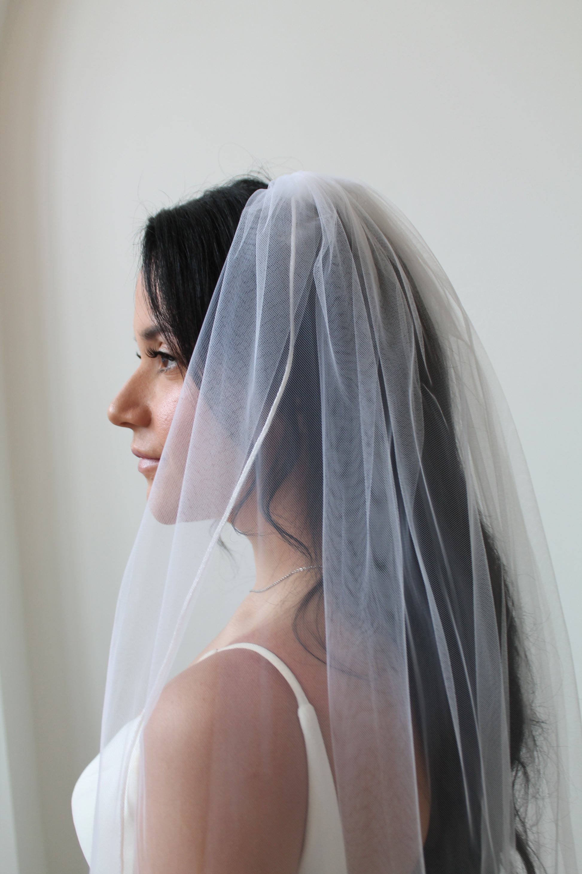 A timeless classic with a clean finish, this veil is crafted from soft ivory tulle and trimmed with a sleek satin cord edge. The subtle contrast adds structure and elegance, framing your silhouette with a smooth, graceful line. A beautiful choice for the bride who loves understated detail with a polished touch.