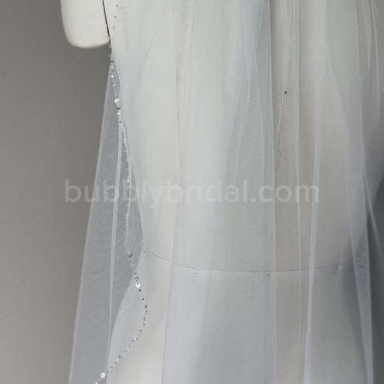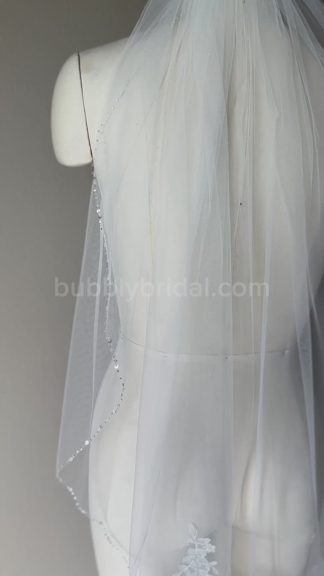 This romantic veil is made with soft ivory tulle and features a detailed floral lace motif along the bottom edge. The remaining border is delicately accented with shimmering rhinestones, bugle beads, and sequins—creating a soft sparkle that complements the lace without overpowering it. A graceful blend of texture and shine for your walk down the aisle.