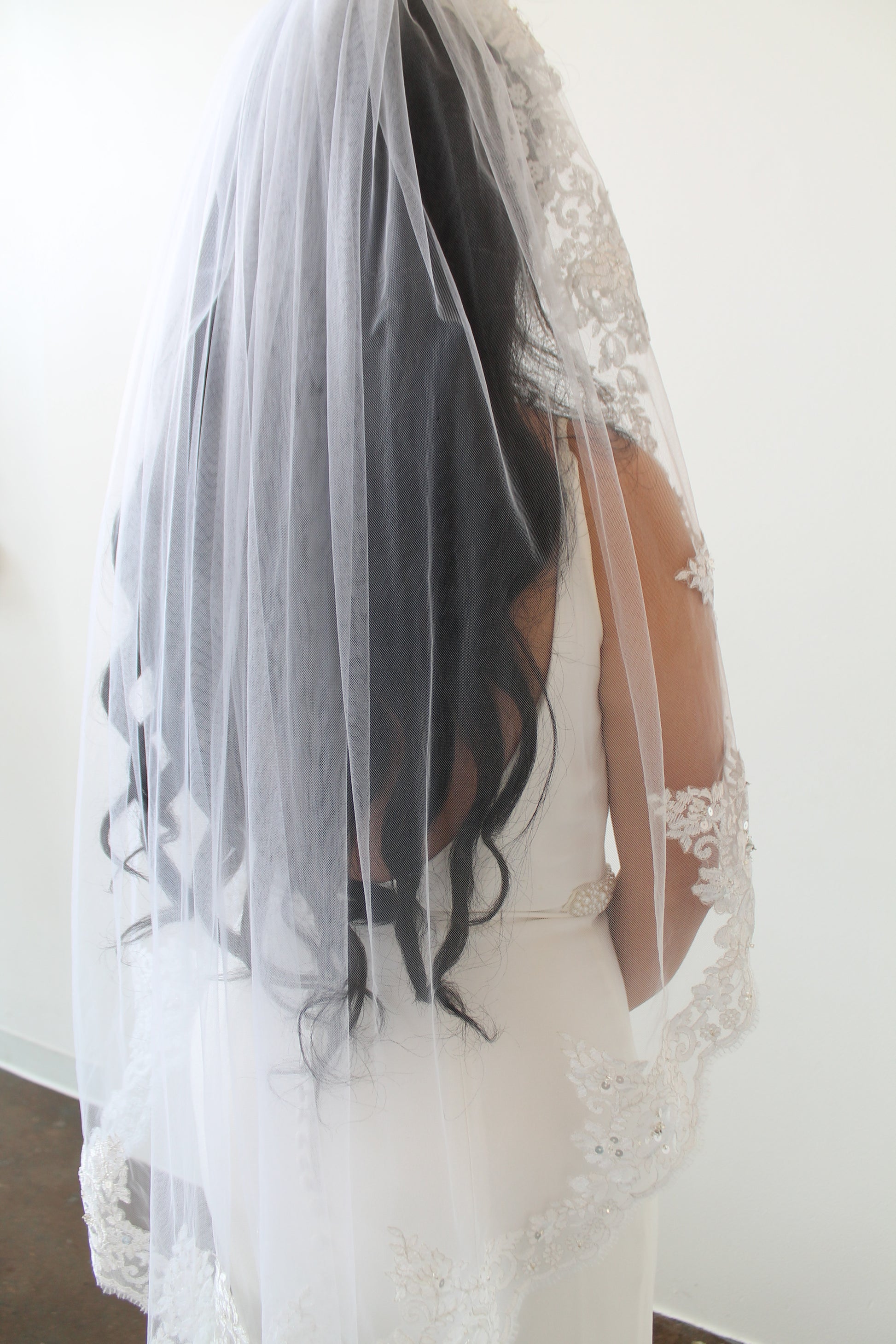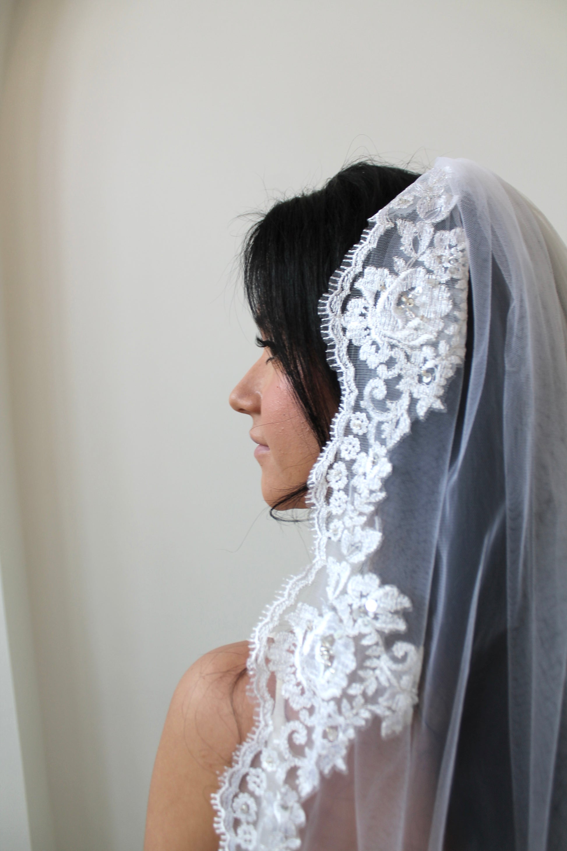 Timeless and romantic, this mantilla-style veil features luxurious Alençon lace with a delicate floral motif on ivory tulle. Intricately hand-embellished with shimmering sequins, silver bugle beads, rhinestone rondelles, and seed beads, it catches the light beautifully with every step. Finished with a fine silver thread along the lace edge for an extra touch of elegance. A breathtaking choice for the bride who wants classic beauty with a touch of sparkle.