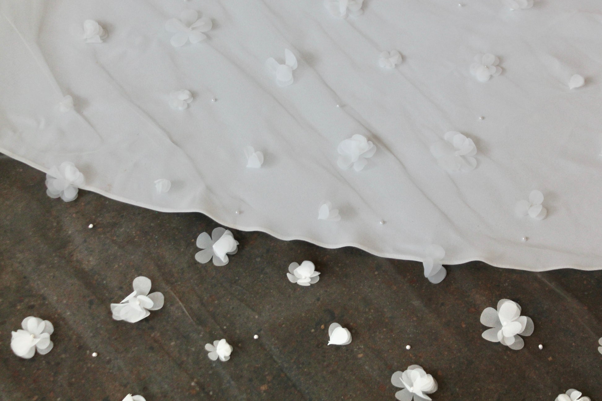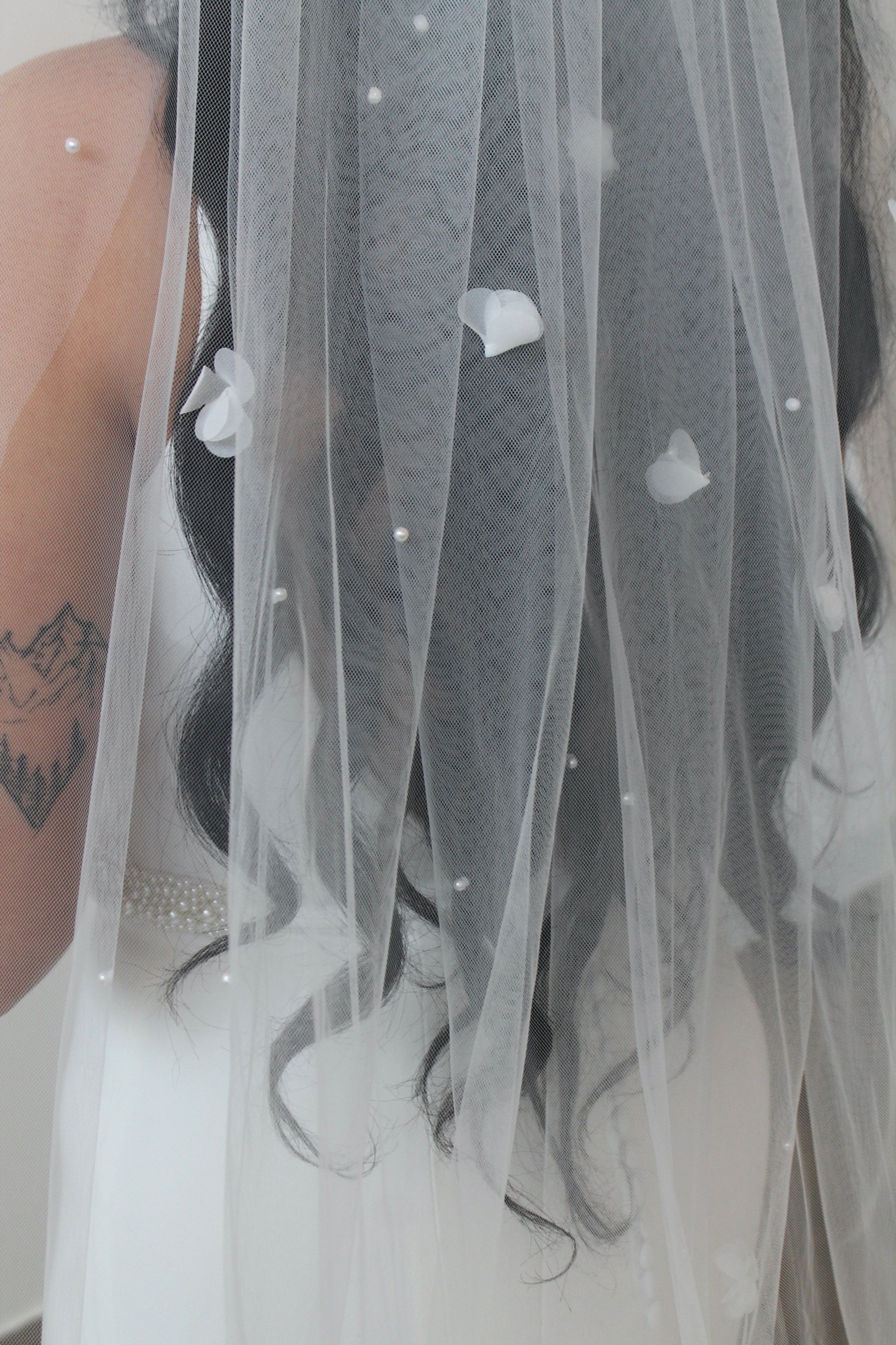Soft ivory tulle is adorned with delicate organza flowers and scattered pearls, creating a look that feels both regal and effortlessly romantic. The dimensional florals and soft shimmer give this veil a feminine, youthful charm—perfect for the bride who wants her look to feel fresh, graceful, and enchanting.