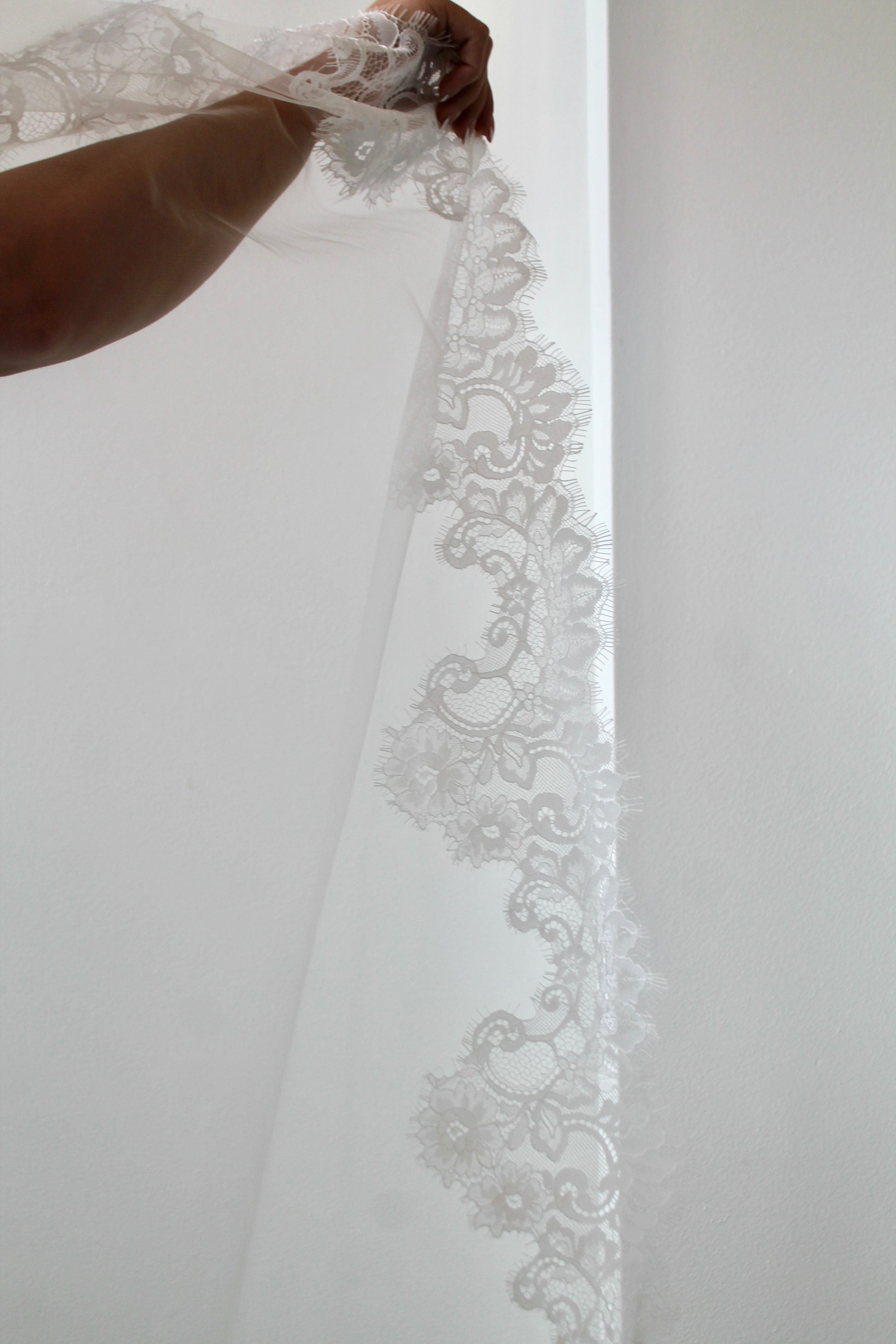 This romantic mantilla veil is crafted from airy ivory tulle and framed with delicate Chantilly lace, creating a soft, vintage-inspired silhouette. The lace extends gently into the hairline for a seamless, graceful finish—perfect for a bride drawn to timeless elegance and quiet beauty.