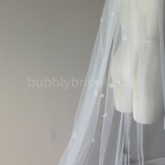 Soft ivory tulle is adorned with delicate organza flowers and scattered pearls, creating a look that feels both regal and effortlessly romantic. The dimensional florals and soft shimmer give this veil a feminine, youthful charm—perfect for the bride who wants her look to feel fresh, graceful, and enchanting.