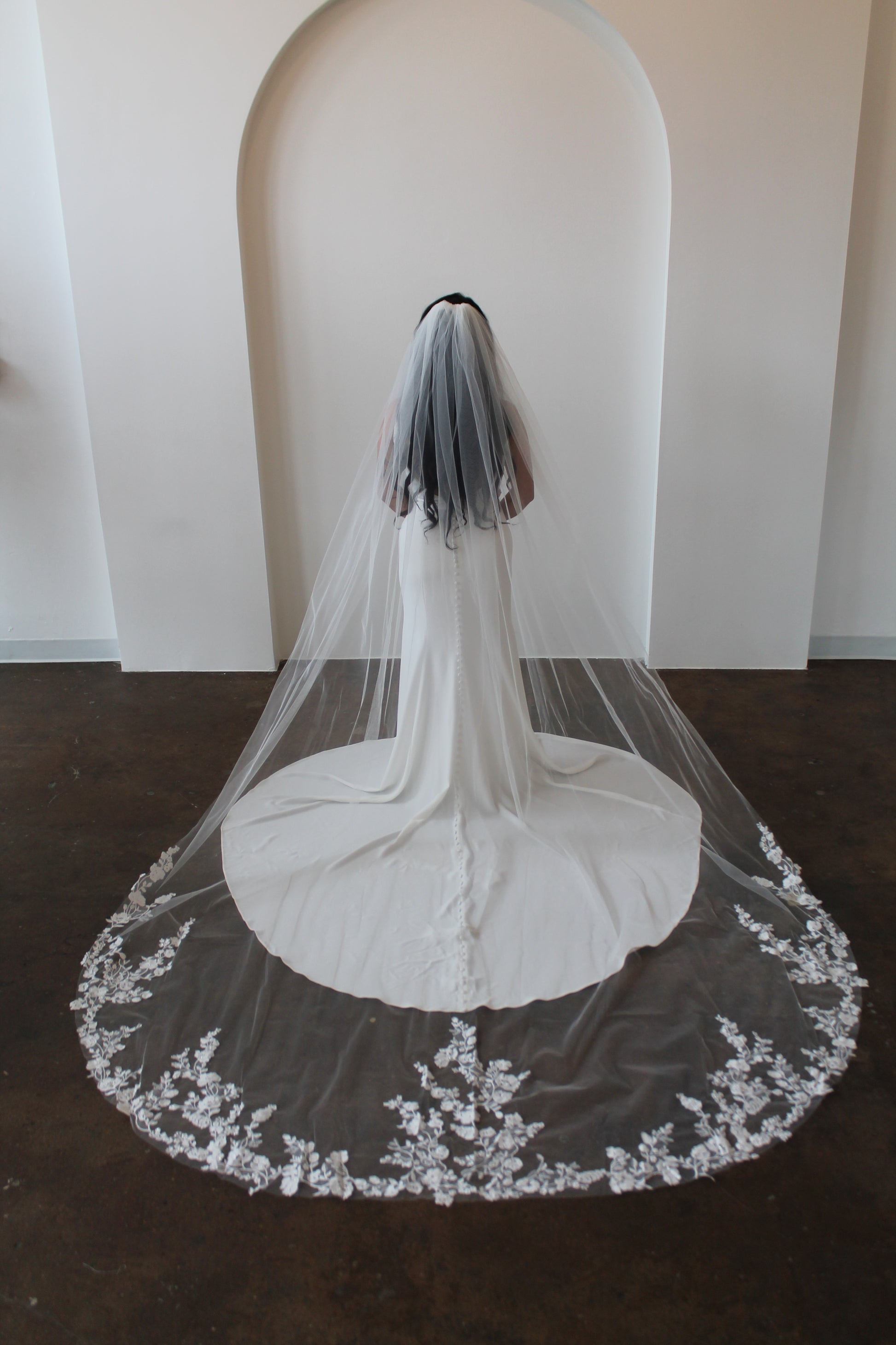 Timeless and romantic, this veil is made with soft ivory tulle and detailed with elegant Alençon lace in a floral design. Delicately accented with rhinestones and clear sequins, it offers a soft, light-catching shimmer that enhances the intricate lace without overpowering it—a graceful balance of classic beauty and subtle sparkle.