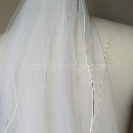 A timeless classic with a clean finish, this veil is crafted from soft ivory tulle and trimmed with a sleek satin cord edge. The subtle contrast adds structure and elegance, framing your silhouette with a smooth, graceful line. A beautiful choice for the bride who loves understated detail with a polished touch.
