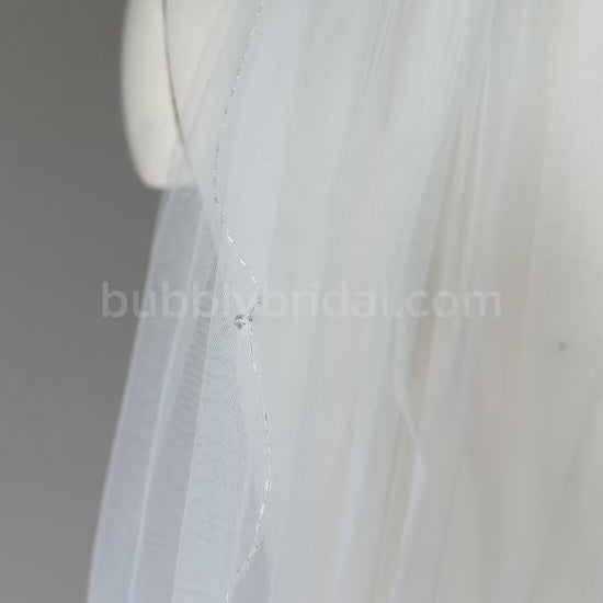 Elevate your bridal look with this scalloped-edge veil, handcrafted from soft ivory tulle. Embellished with a radiant mix of Swarovski crystals and rhinestones, it sparkles beautifully in the light. The edge is delicately accented with silver bugle beads and shiny seed beads, adding refined shimmer and texture. A stunning choice for the bride who loves detail and elegance.