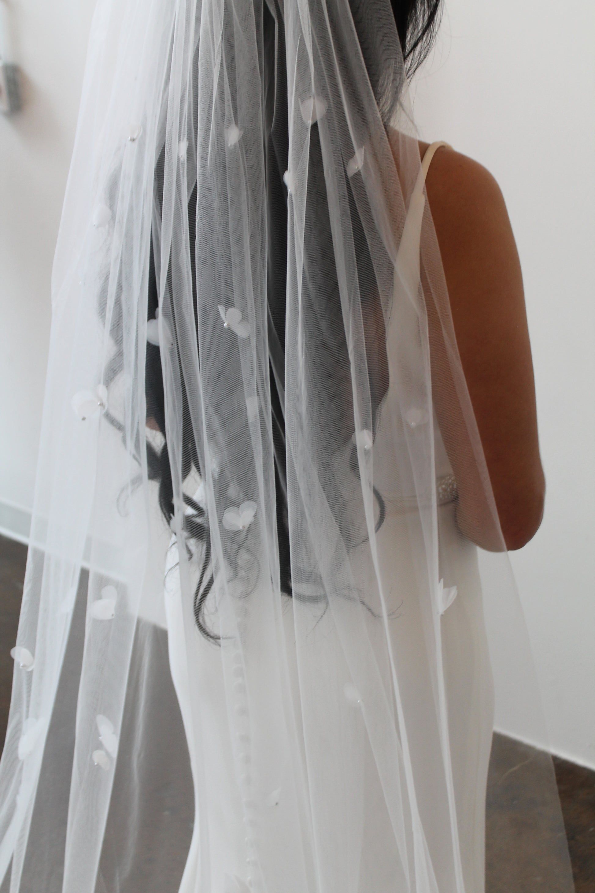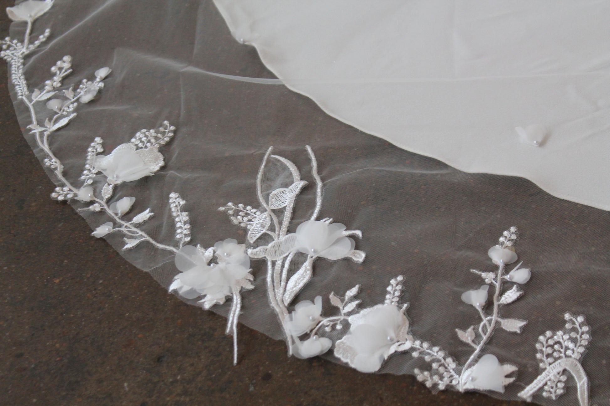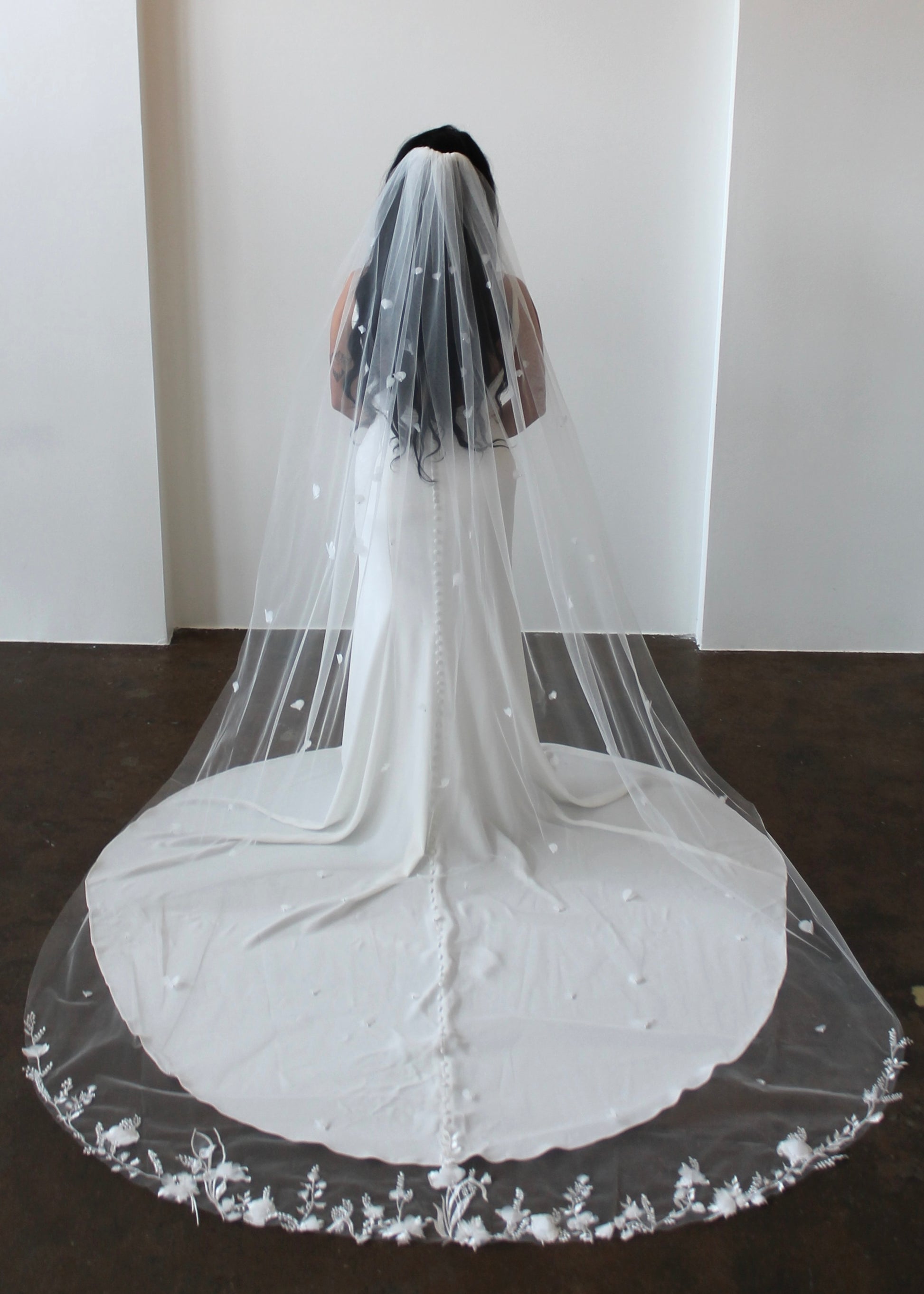 Soft ivory tulle is sprinkled with delicate organza flowers, each centered with a pearl accent for a touch of shimmer and texture. The hem features floral embroidery that echoes the scattered blooms, creating a veil that feels effortlessly charming, romantic, and full of movement—like a garden in bloom.