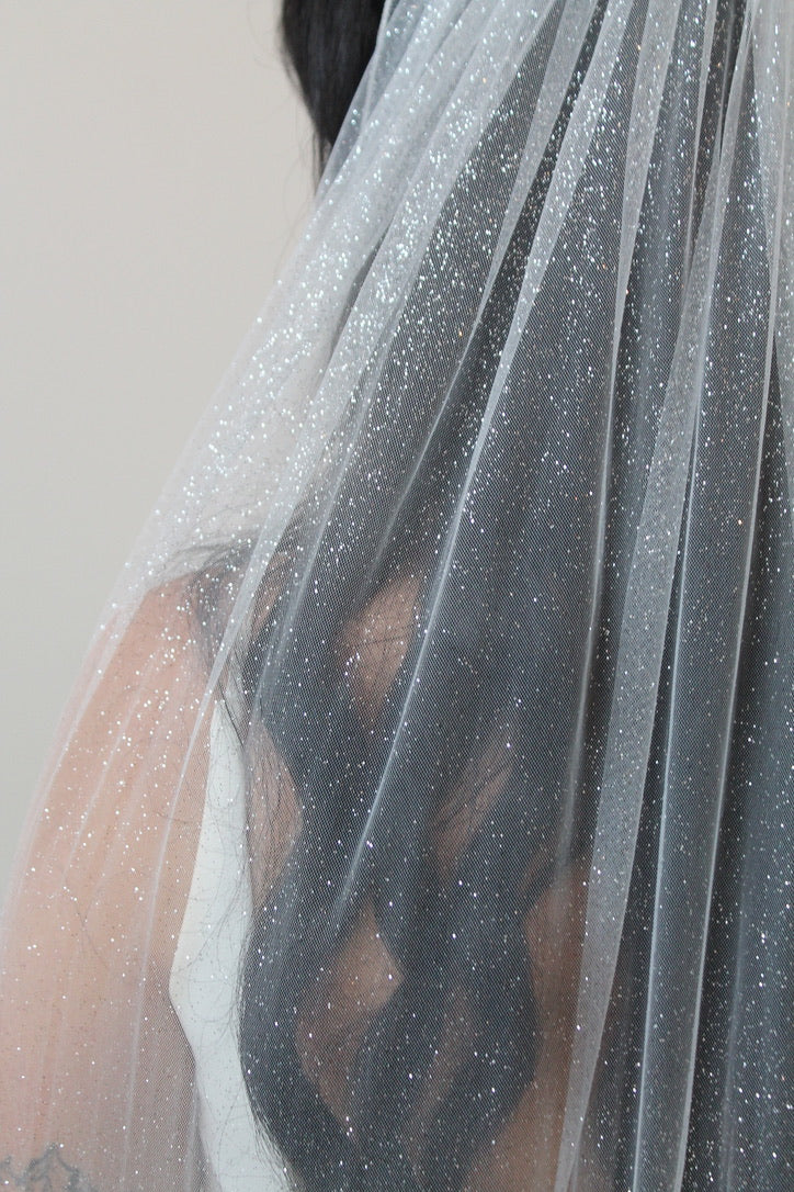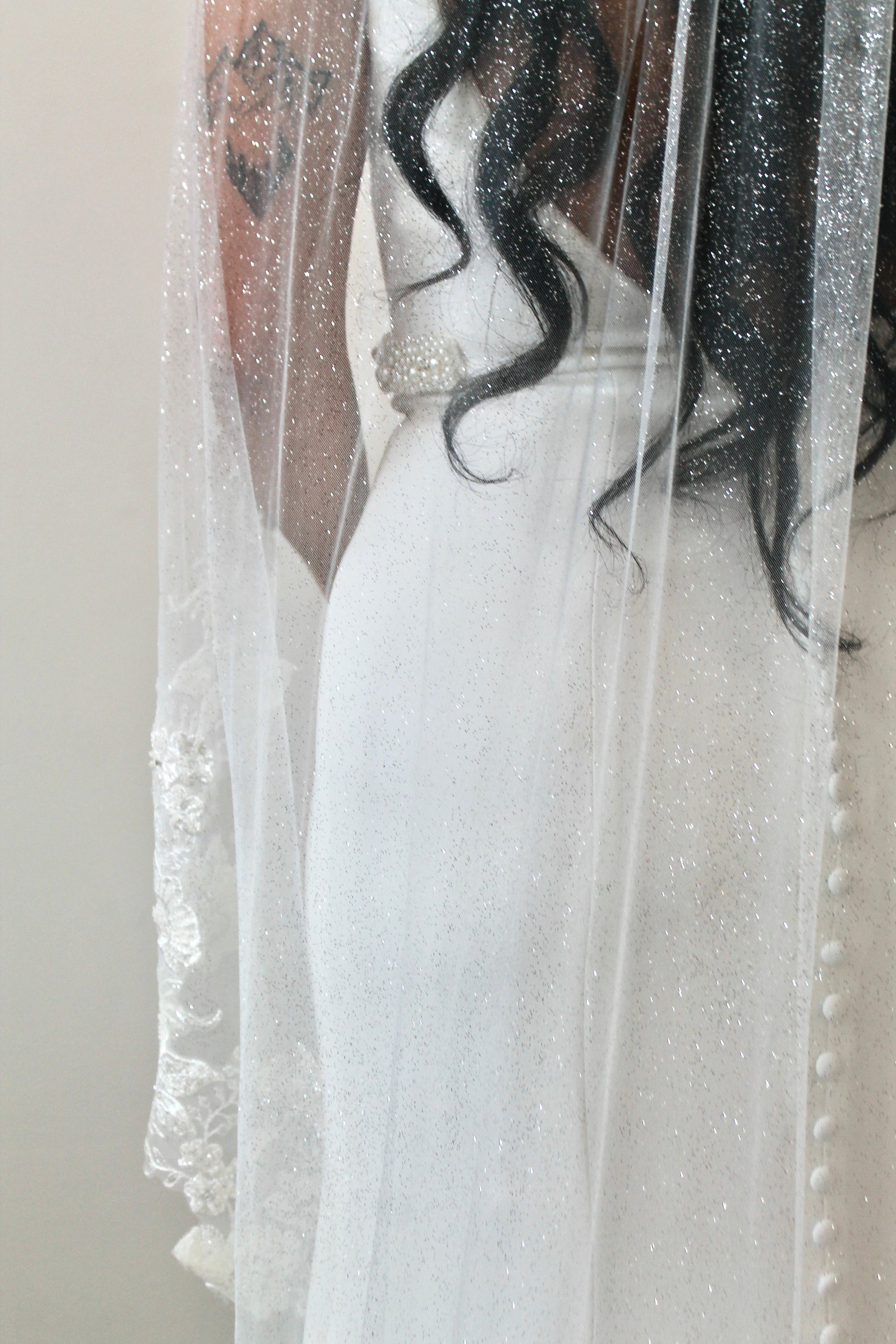 Available in and pictured in a glitter tulle variation for the bride who is looking for an extra level of glam to add to her perfect look.