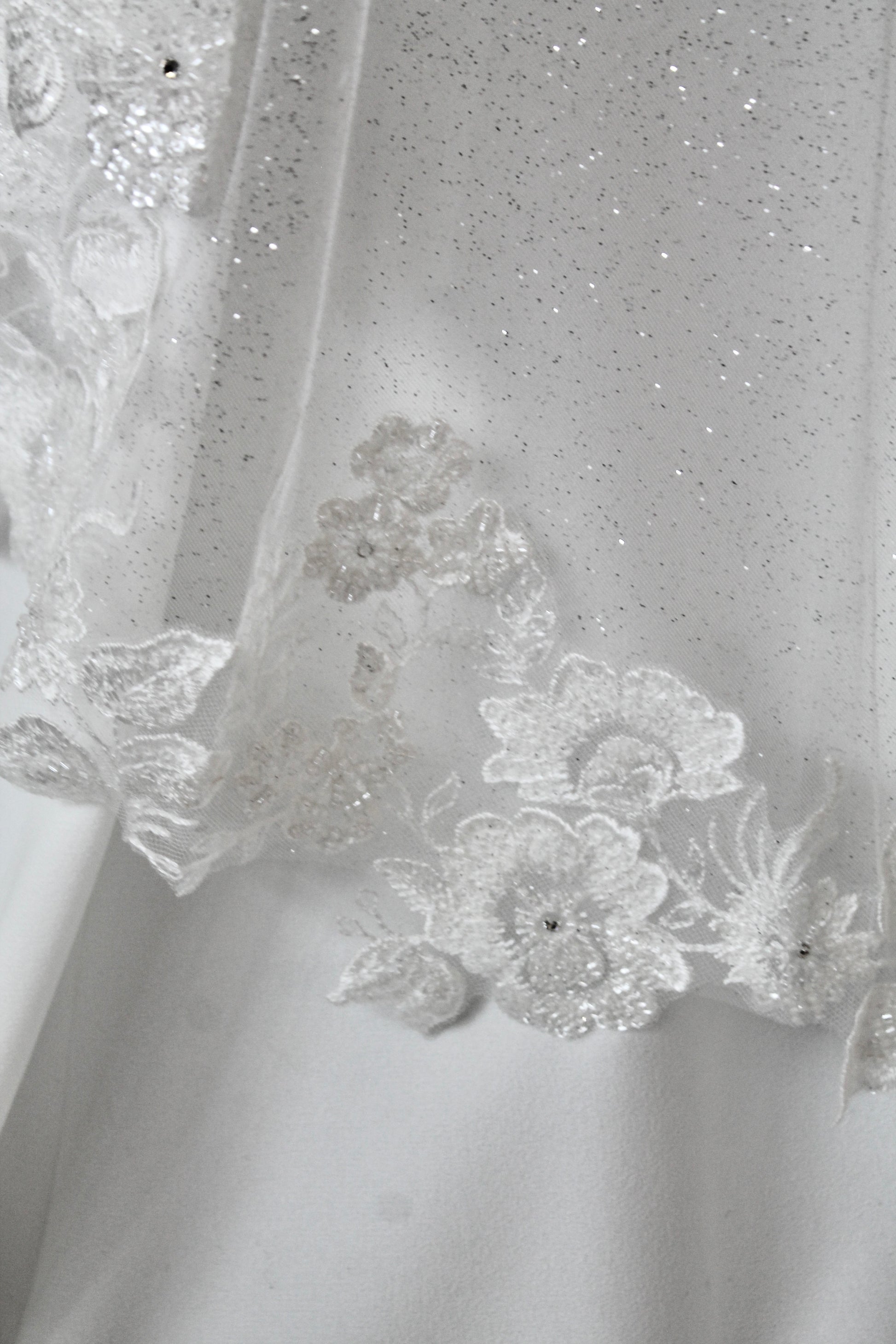 Romantic and refined, this waltz-length veil is crafted from soft ivory tulle and finished with elegant Alençon lace in a floral motif. Sparkling rhinestones, delicate sequins, and subtle beading are hand-placed along the lace for a graceful, light-catching finish. Perfect for the bride seeking movement, elegance, and timeless detail.